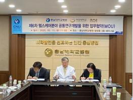 충남대병원(병원장 윤환중)은 알피오플래닛(대표 고경곤), 국민대 산학협력단(단장 신동훈)과 헬스케어 분야 신기술 공동연구 활동 및 기술정보 교류를 위한 3자 업무협약(MOU)을 15일 충남대병원에서 체결했다.
